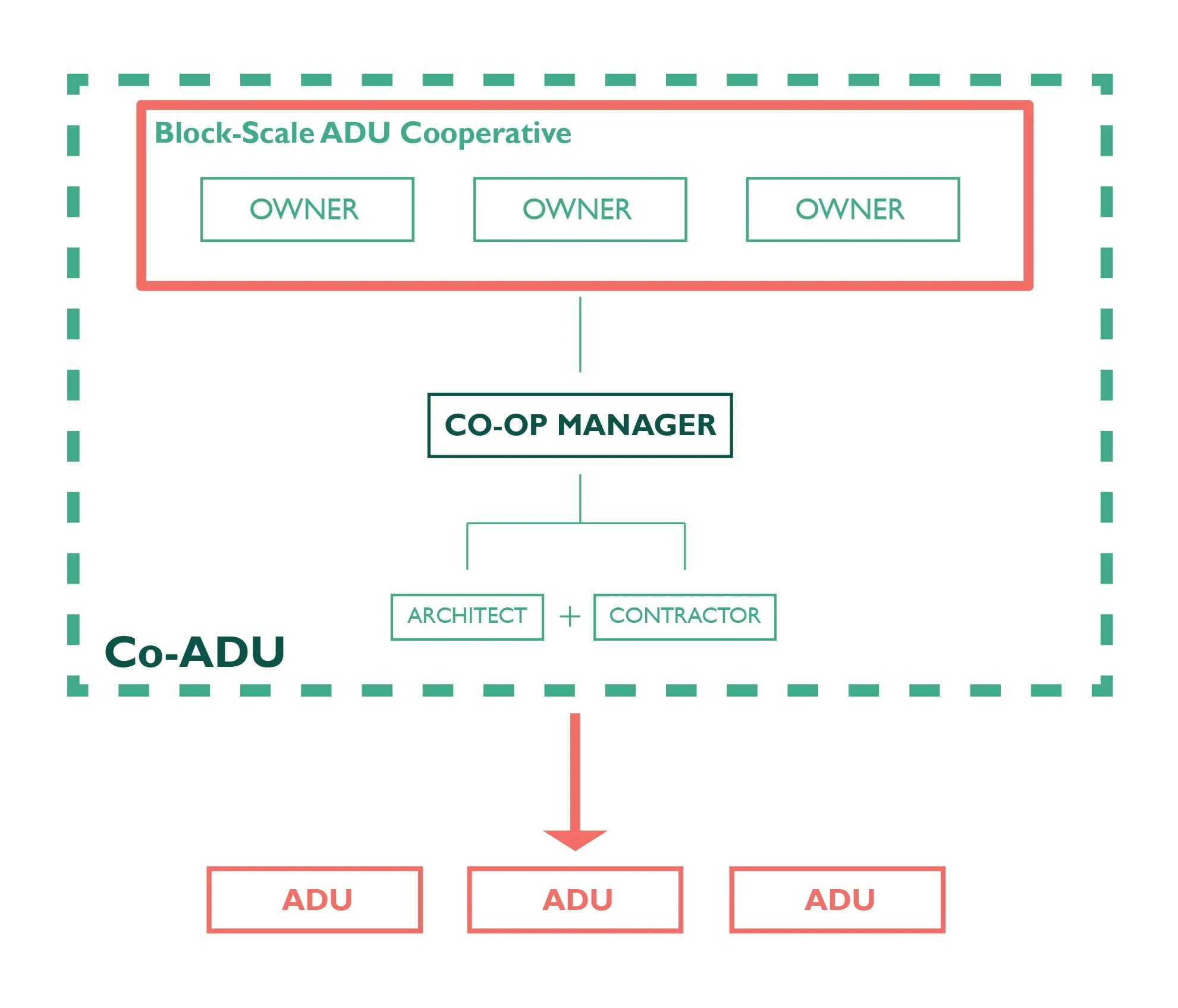 Substantially, the co-operative ADU model allows property owners to implement tract housing style efficiencies in the build process to reduce construction budgets. Teams, including subcontractors, can move from site to site quickly, minimizing mobilization costs associated with individual projects. Co-ADU seeks to support the founding of these owner co-operatives across the region – and ultimately the country – guiding the co-ops through the process of organizing, financing, designing, and construction. The scale of each co-op can vary, and depends in part on the level of interconnectivity between sites and the level of commitment from property owners to a neighborhood co-op.